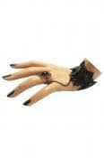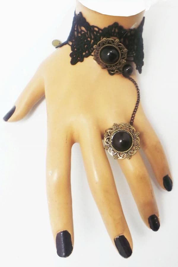 Gothic Black lace bracelet with brass framed, Black Faux jewel ring attached to the bracelet by a brass chain.