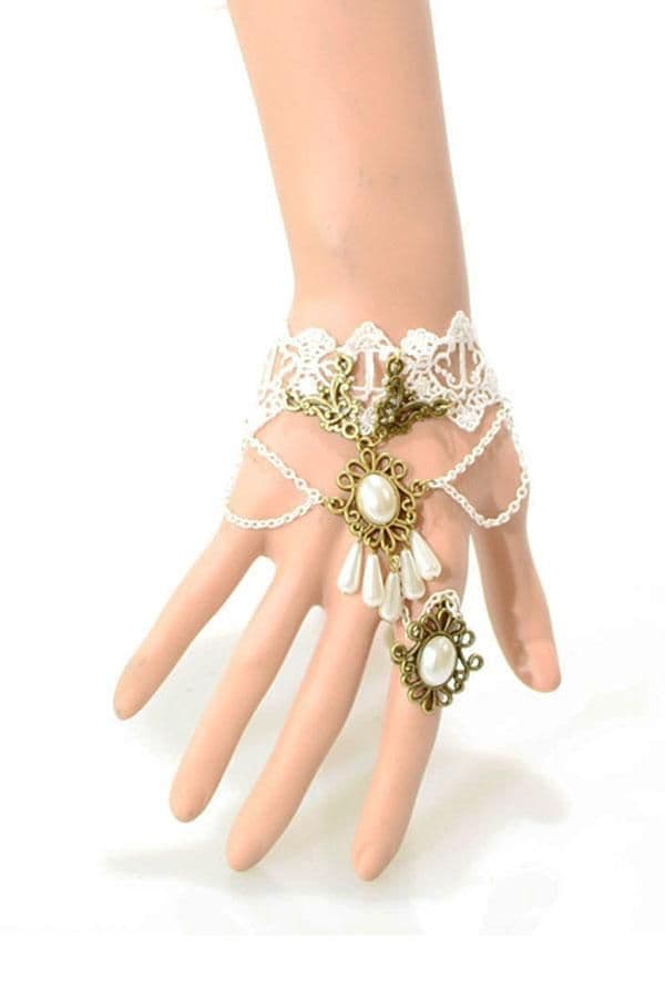 Pretty White lace bracelet decorated with brass trimmings, pearl teardrop beads. Adjustable ring attached by a chain.